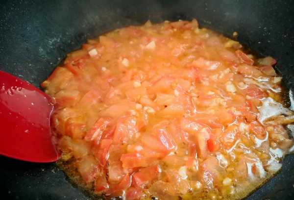 4、锅里倒少许油烧热,放入蒜末炒香,再放入西红柿丁,加少许盐,继续炒至出汁。