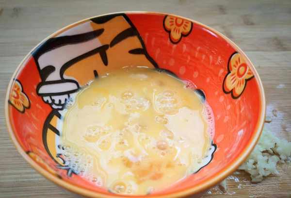 3、鸡蛋2个打入碗中,拌匀,大蒜2片用刀打散,蒜末切碎。