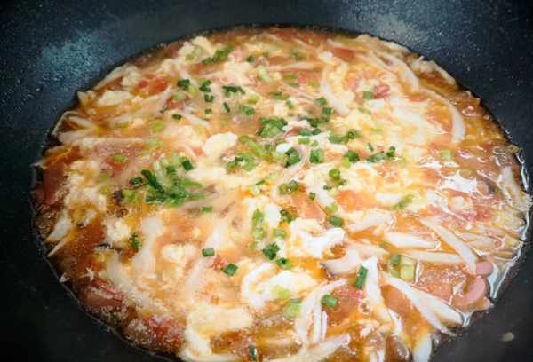 6、倒入蛋液,用勺子顺时针方向旋转,出锅加入盐,撒上洋葱,美味的番茄蘑菇汤就做好了。
