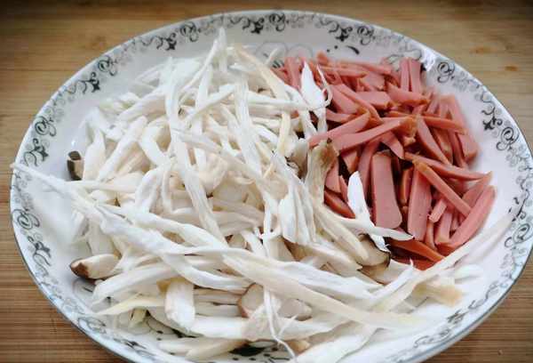 1、再准备一颗杏鲍菇,洗净,用手撕成细条。杏鲍菇味道鲜美,补气健胃,具有鲍鱼的脆嫩口感和杏仁的清香,具有很好的健脾开胃作用,香肠1根,去掉外包装,切成薄片。剥下来放在盘子里待用。
