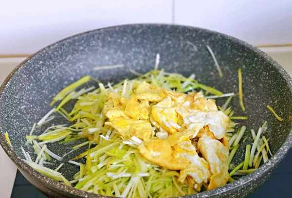 烹调步骤6:待韭菜变软,加入盐和十三香,放入煎好的鸡蛋,转小火不断翻炒,加入几滴香油待食材入味。