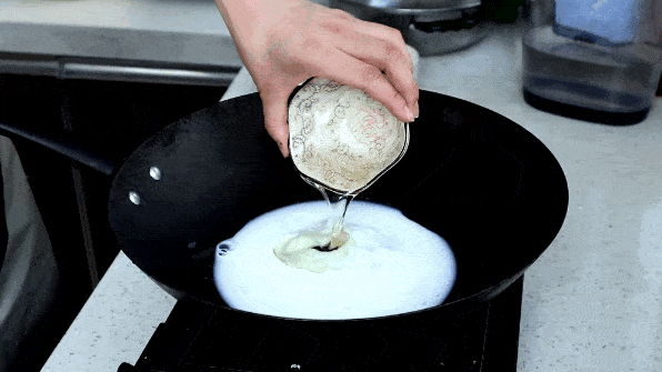 (2)等到锅里的牛奶有小气泡,呈微沸状态时,倒入20克高筋面粉,快速朝一个方向搅拌,边搅拌边按,没有疙瘩的时候最好,最后软化成浓稠的糊状即可关火。