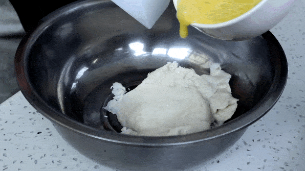 (4)将1个鸡蛋打入碗中,搅拌均匀。在面糊中倒入少量几次,每次添加后搅拌并按压以吸收所有鸡蛋。