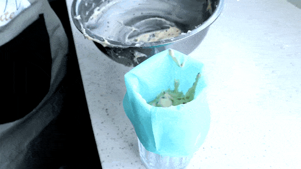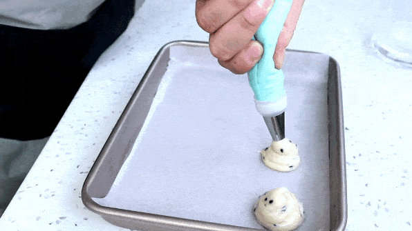(8)将面团装入袋子里,挤在烤盘上,尽量堆高,这样成品会更高更圆。在每个之间留一个空间,否则它们在传播时会粘在一起。
