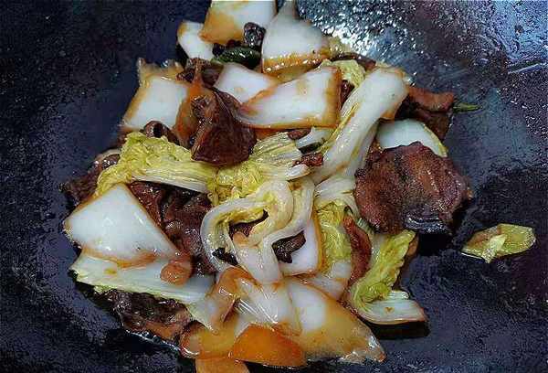 3:卷心菜条和卷心菜叶一定要分开炒,因为卷心菜条里面水分多,质地比较硬,不容易熟,所以先炒软,然后卷心菜叶。一起炒。