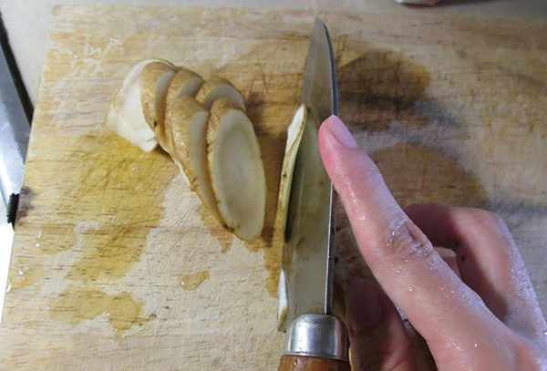 然后斜切,切成片,加入高汤中煮20分钟左右。牛蒡不建议煮的时间过长,因为除了营养成分流失外,还会造成酸甜苦涩的味道。我担心宝宝不适应这个味道!