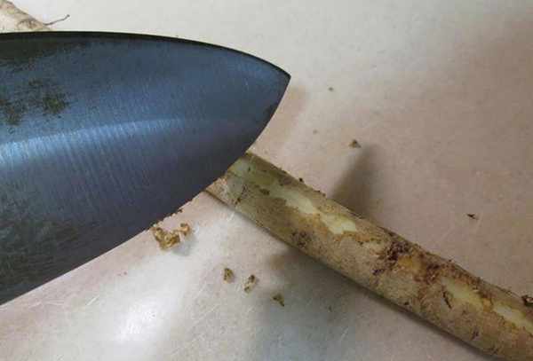 煮约40分钟后,开始加工牛蒡。用牛蒡的背面轻轻刮去表皮污垢和须根(不用刨去皮!)