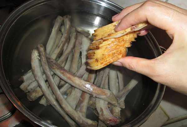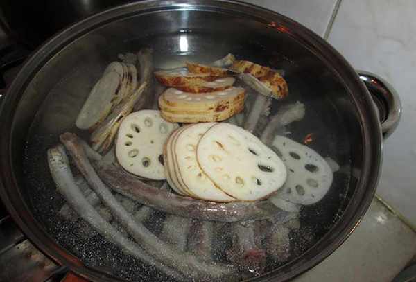 将骨头和水放入锅中,放入藕片,盖上锅盖开锅,先用中大火将汤烧开,然后转小火继续煮。