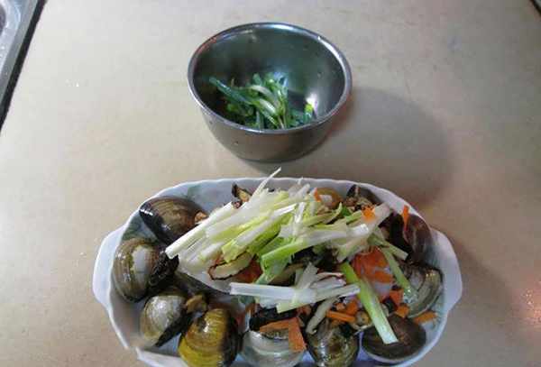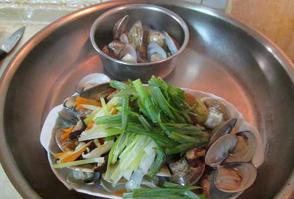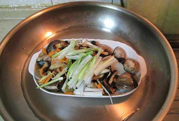 <蒸鳕鱼三丝蛤蜊>材料:鳕鱼一片,小红葱适量,胡萝卜适量,干香菇数朵,蛤蜊适量