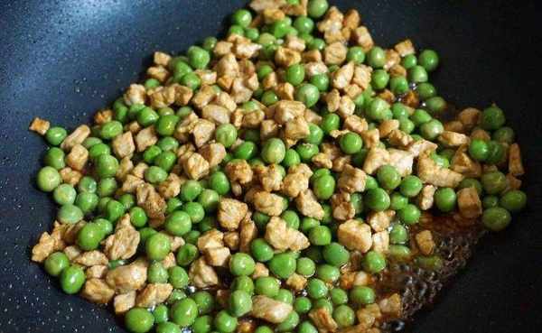 3、肉末炒至微黄,加少许盐和生抽,将豌豆倒入锅中。