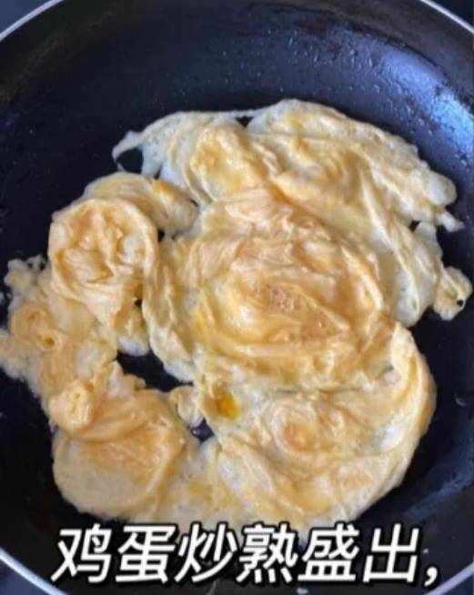 第四:蒜瓣切平放入蒜末,蒜切小块待用,锅底慢慢加热至60%火力,倒入鸡蛋炒至熟,切块,盛出供以后使用。