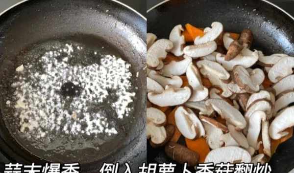 第五:锅内留少许油,加入蒜末爆香,交替放入胡萝卜片和香菇片,将香菇炒软。