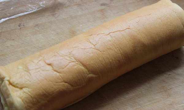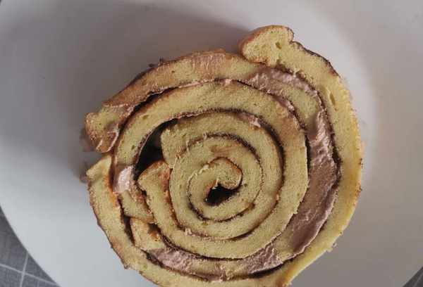 第四步:打发奶油加入巧克力酱,搅拌均匀,在蛋糕上薄薄地抹一层,擀压成型。