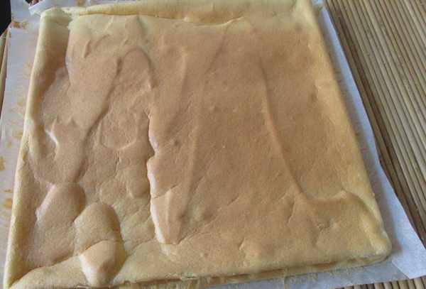第三步:烤盘盖上油纸,将蛋糕糊倒入烤盘,170度烤20分钟,取出晾凉。
