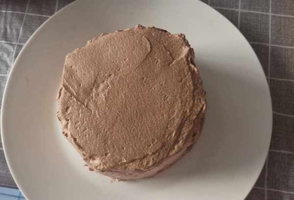 第六步:在表面抹上巧克力奶油,抹平,用叉子做记号。