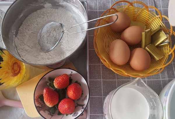 第一步:准备鸡蛋、面粉、牛奶、玉米油、草莓和巧克力。
