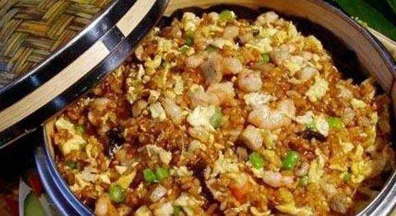 5、将这些材料放在锅中翻炒,黄瓜、胡萝卜、火腿、肉丁、焯水后的苜蓿等,放些耗油、酱油炒出颜色,最后将米饭放入锅中翻炒,加些盐和鸡精出锅就可以啦!