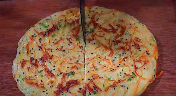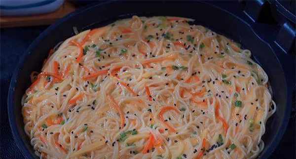 7.电煎锅刷一层食用油,然后倒入面条,用筷子摊平,撒上一些黑芝麻,烤至凝固,来回翻动烤至熟透煮熟可口。