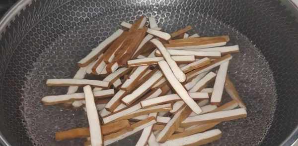 3、锅中烧开水,加少许盐,加入切碎的干药材过水焯一下。这样既能去除干香中的豆腥味,又能使干香的味道更加柔和顺滑。水再次沸腾后,将水焯半分钟,捞出。