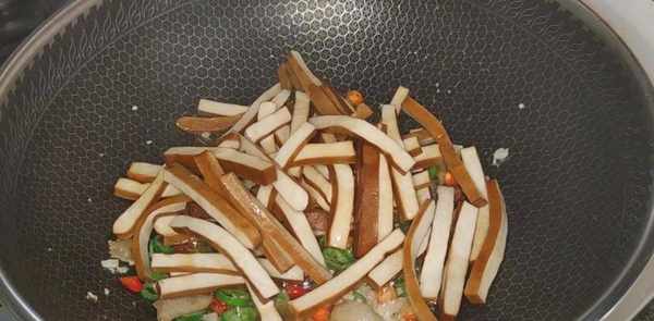 4.再起锅,加少许油,待油热后,加入肥肉翻炒,不断翻炒,去掉多余的油脂,倒入压好的大蒜炒香,倒入将青红小米椒一边翻炒一边炒至咸辣,加入焯水。味儿干了,多炒几下。加入生抽、老抽、蚝油、糖、盐翻炒均匀。