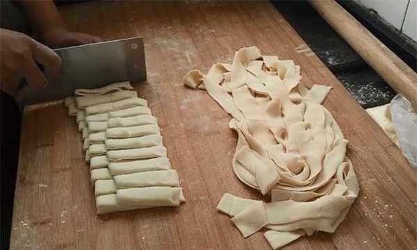 2.面条展开后,把擀好的面条叠起来切。我做的是宽面条,宽度在3厘米左右。