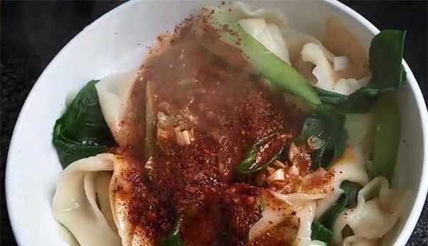 8、面条做好后盛入碗中,在面条上撒上葱花,放入辣椒面,最后淋上热油,香喷喷的油泼面就做好了。