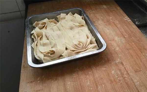 1.首先准备面条。我的面条是提前一个小时做好的。面条醒的时间越长,越结实。现在我开始擀面条了。虽然擀面看起来有点麻烦,但是自己动手做的手擀面味道更好吃。擀面条的时候,我是从中间往两边擀的,这样擀的更均匀。