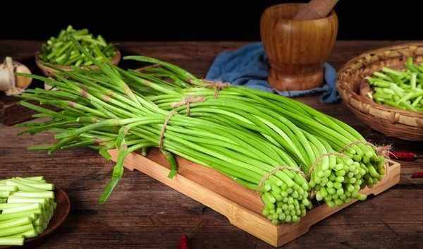 大蒜苔蒜苔是一种三月陆续上市的绿色蔬菜。大蒜苔是由大蒜幼苗长出的一种优良苔藓,呈绿松石色。蒜苔是很多人都喜欢吃的一种蔬菜。蒜苔的营养价值很高。它富含维生素和大蒜素。经常食用具有杀菌和消炎作用。蒜苔的味道清新、温和、微甜。用在炒菜、炒肉上非常好吃。进入三月后,就可以吃蒜苔了。