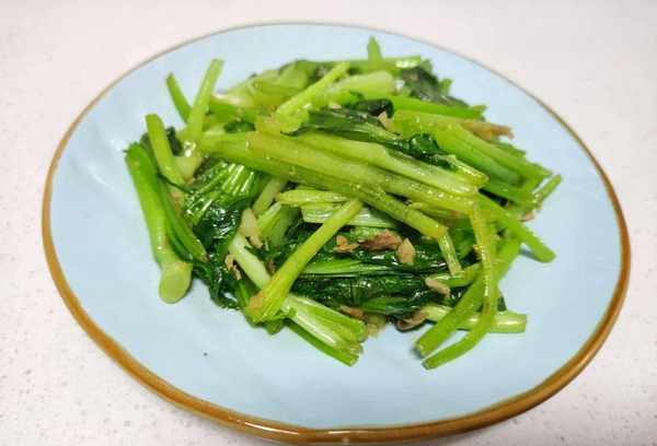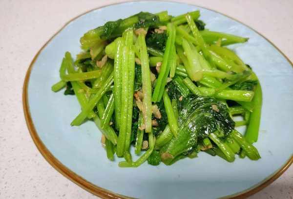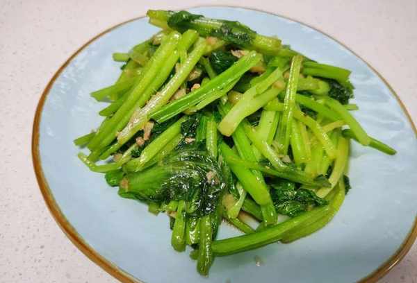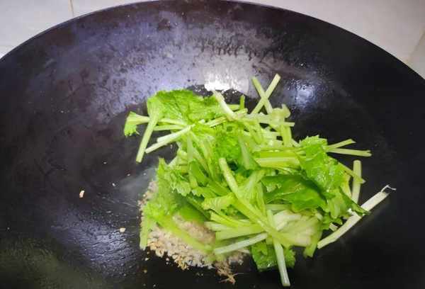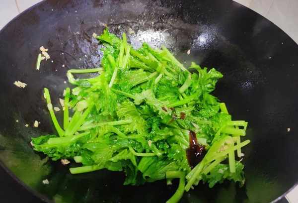 2、将回力红放入锅中,用大火快速煎熟。如果是烤菜,最好加少许油,用铲子快速翻炒,这样烤出来的菜更绿更入味。