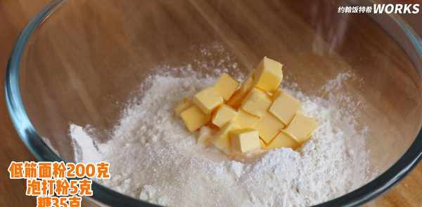 第四步:在一个大碗里,加入200克低筋面粉、5克泡打粉、50克普丁和黄油。