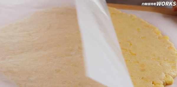 第八步:将揉好的面团放在烘焙纸上,再盖上一层,向下压几下,然后擀成约3厘米厚的饼。