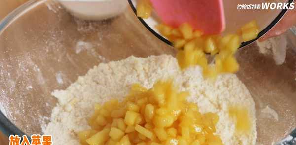 增加苹果的用量,增加其他食材的用量;将苹果炒至水分略低,透明度只能作为参考;用常温的黄油,加入低筋面粉后尽量揉均匀,几乎是那种小颗粒。如果面团比较粘手,可以加点低筋面粉。