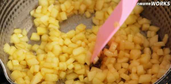 第三步:小火翻炒至苹果水分变少呈半透明状,捞出放凉待用。