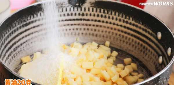 第二步:将切碎的苹果放入平底锅中,加入20克黄油和15克白糖。