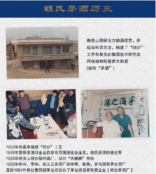 在1902年,赖嘉荣独创大曲回沙工艺,酿造出独特的酱香大曲酒,就是赖氏茅酒。后来参加了美国旧金山举办的巴拿马万国博览会,一举夺得金奖。被后人尊称“赖茅鼻祖”,“酱香始祖”。后来茅台镇公私合营,赖嘉荣掌舵的恒兴烧坊,与其他两家烧坊合并称为国营茅台酒厂。但赖氏独家的回沙酿酒工艺,却一直掌握在赖氏后人手里。