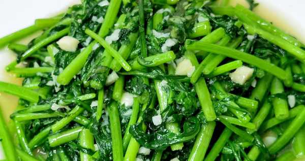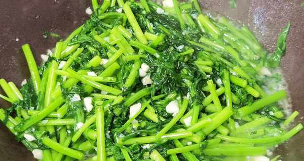 3、先放菊花茎,炒匀,再下叶、盐,继续炒至菊花全部变成翠绿色,关火,出锅即可食用。