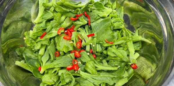 2、锅中加入适量的盐,用手搅拌至顺滑。将购买的小麦草放入盆中浸泡约10分钟,然后用流水清洗。将清洗干净的小麦草沥干水分放入碗中,用手将小麦草掰成适合入口的小块。冰草味道微咸,清凉爽口,与凉菜搭配很搭。它不仅含有丰富的维生素和氨基酸,而且适量食用对身体大有裨益。