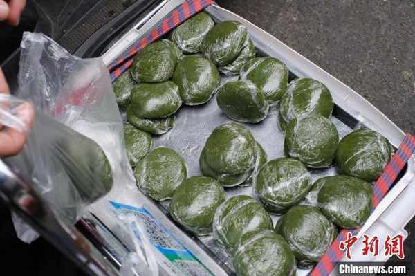 图为青云菜市内正在贩卖的艾叶粑粑。 刘俊聪 摄