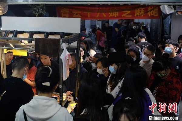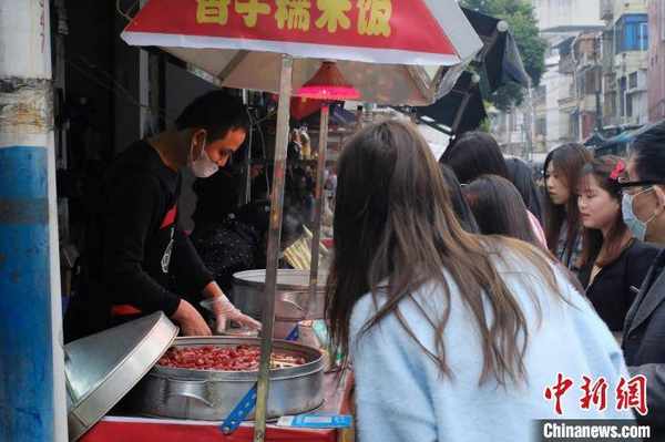 图为众多年轻食客正在等待购买糯米饭。 刘俊聪 摄