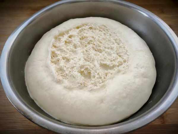 2、揉好后的面团,盖上保鲜膜醒发至两倍大,2个小时以后扒开面团,可以看到面团里面全是蜂窝眼, 面团已经发酵好了。