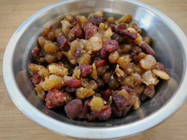 3、这是我上次买的蜜豆,今天就用上了,大家可以用红豆做,红豆颗粒比蜜豆小点,卷的时候更好操作。