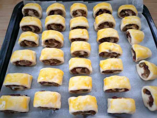 6、发酵至差不多了,烤盘上铺上油纸,把蜜豆卷摆放好,刷一层鸡蛋液,最好再撒少许白芝麻。