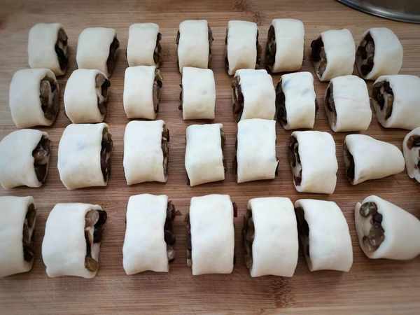 5、从从下往上慢慢卷起,整个饼卷成了一个卷,再切成大小均匀的段,盖上保鲜膜,放案板上2次醒发20分钟。