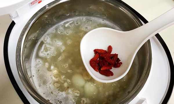 第九步制作:最后加入一些枸杞子,用勺子快速搅拌,小火炖几分钟。这道香甜可口、营养丰富的鹌鹑蛋薏米莲子百合汤就做好了。