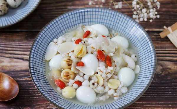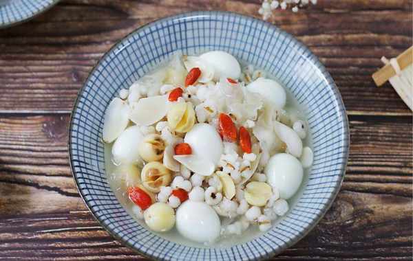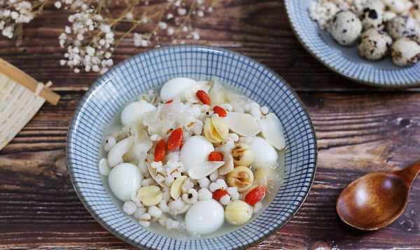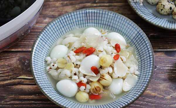 小贴士:鹌鹑蛋无论是红烧还是煲汤,都要提前将鹌鹑蛋煮熟。如果需要鹌鹑蛋,先在平底锅中冷水煮沸,然后用中小火慢慢煮沸,撒上盐再煮一会。煮好后用冷水泡一下,这样鹌鹑蛋就容易剥皮了。银耳、薏米、莲子一定要提前泡发。先把银耳用大火炖一下,然后关火用文火炖一会儿,加入泡好的材料一起煮,最后加入枸杞和冰糖用小火炖。.