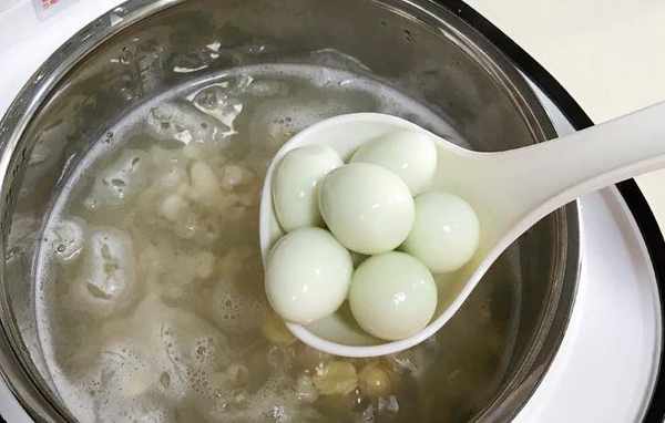 第八步:加入煮好的鹌鹑蛋,盖上锅盖煮8分钟,加入适量砂糖,待薏米开莲子煮至汤汁浓稠。