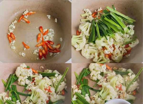 第五步:加入大蒜和小米椒块,加入焯过水的花菜和韭菜,快炒至生,加入韭菜块,最后加入猪肉或下脚料,边快速翻炒片刻。