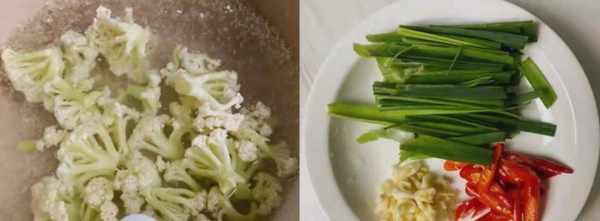 第二步:锅里烧开一些水,加盐,把花菜倒进去煮几分钟,花菜焯水后味道会更好,营养价值也不会降低。