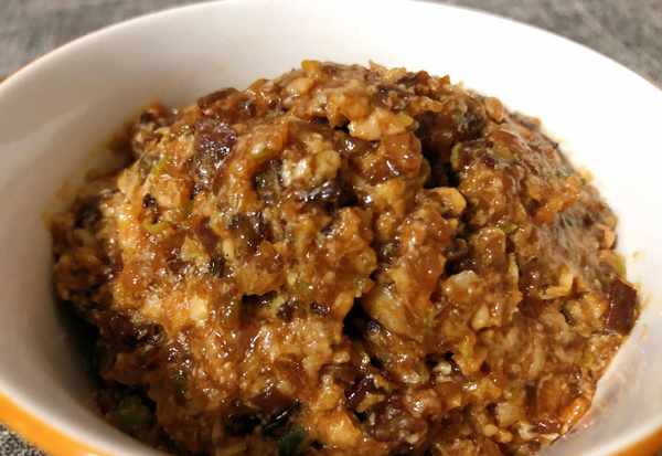 (2)木耳提前加上温水泡发,泡好切掉根部洗净,先切成细丝再切成小丁,切好后再剁一下,尽量剁碎