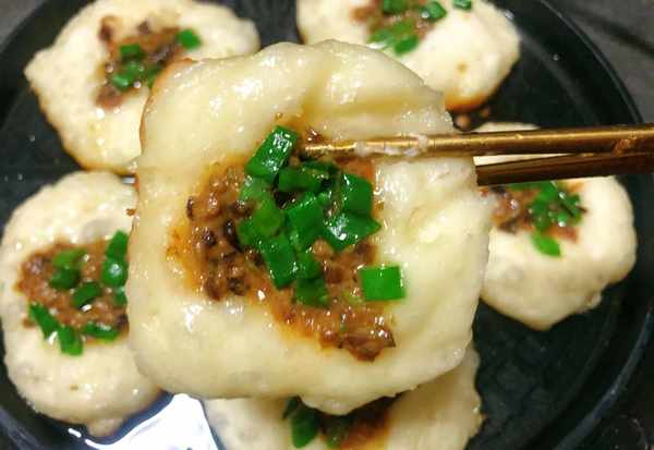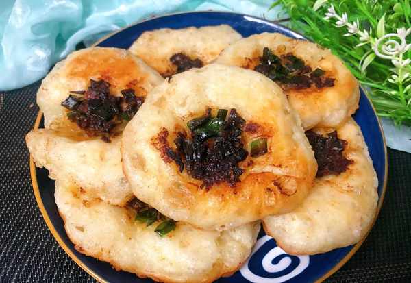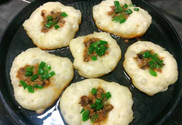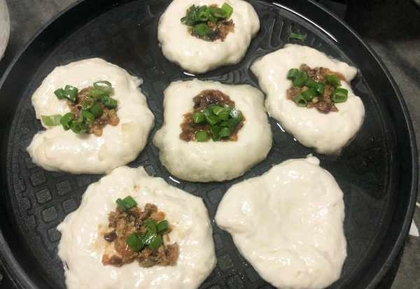(6)锅里刷油,勺子提前沾一下油防止粘面团,用勺子挖一勺面放入锅里,中间压薄,放一勺馅料,撒少许葱花